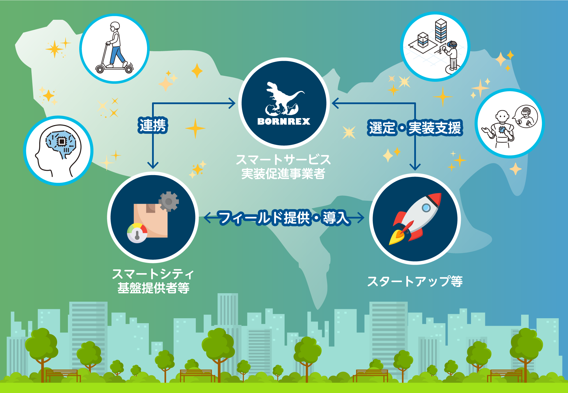 (※2)「スタートアップ等」:スマートシティ基盤提供者等やスマートサービス実装促進事業者と連携しながら、スマートサービスの実装を担う事業者