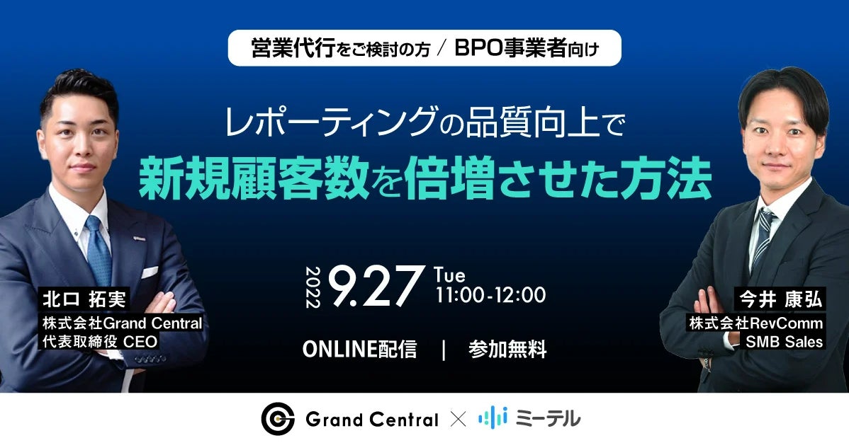 創業1期目で大手上場企業から新規立ち上げ企業まで100社以上のセールスコンサルティングを行ってきた株式会社Grand Central(本社:名古屋市中区、代表取締役CEO:北口拓実)は、株式会社RevCommと2022年9月27日(火)に無料オンラインセミナー「レポーティングの品質向上で新規顧客数を倍増させた方法」を開催することをお知らせいたします。
