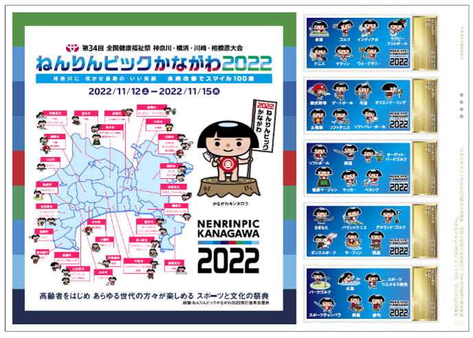 ○ 大会の開催を記念し、オリジナル フレーム切手「ねんりんピックかながわ2022」が日本郵便株式会社南関東支社より数量限定で発売されます。(「フレーム切手」は日本郵便株式会社の登録商標です)