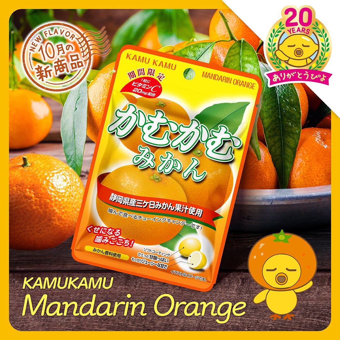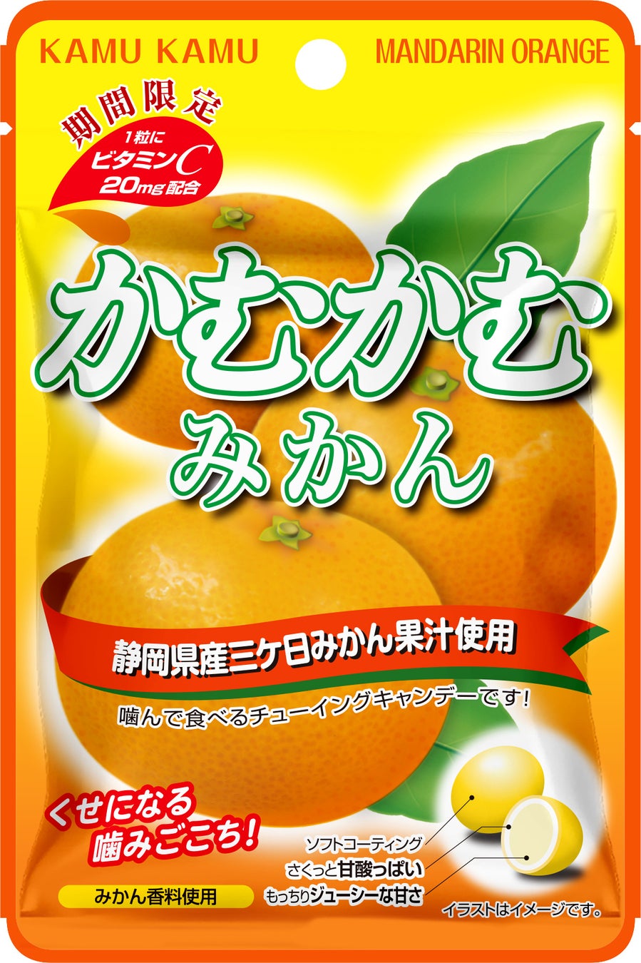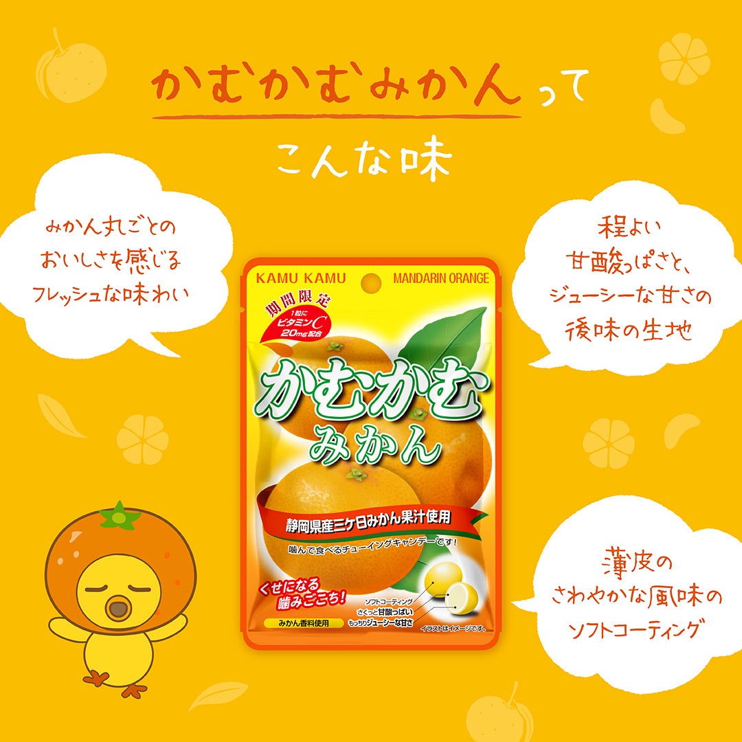 10月はかむかむシリーズで定番なフルーツフレーバーを起用しました。そしてフルーツの中でも10月頃から旬な時期が始まるみかんを採用。三ケ日みかんの特徴として日本の中でもトップクラスの日照量の産地で栽培され、その日差しに当てられて育つみかんは糖度を向上させ甘い果実になります。また三ケ日の水はけのよい土壌を活かし栽培することで、高品質な締まった三ケ日みかん独特のコクを作り出しております。甘さとコクを持つ三ケ日みかん果汁を使用してかむかむみかんを開発致しました。