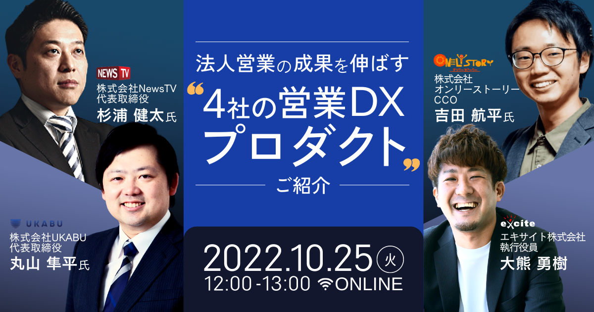 本ウェビナーでは、エキサイト株式会社、株式会社NewsTV、株式会社UKABU、株式会社オンリーストーリーが、「認知獲得手法」「仕組み化」「営業教育」「ABM」という4つの切り口で、これからのBtoB営業・マーケティング手法をお伝えします。