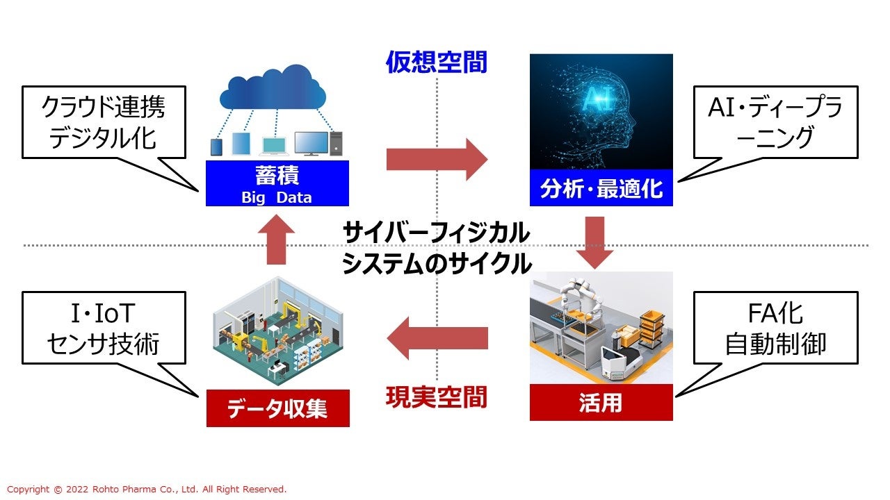 IoTやセンサ技術を活用して人・設備・プロセスの可視化を行い、データ化したものを仮想空間で蓄積し、AI、ディープラーニング等で作業・動線・ライン配置・負荷シミュレーションを行うことで、実際のプロセスの最適化を図るシステム