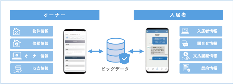 当社は、入居者情報やオーナー情報、物件情報、修繕情報に加え、問合せ履歴、家賃支払履歴、更新、退去情報等のビッグデータの収集が実現します。
