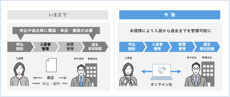 これにより、人的コストや郵送費は削減し、入居者は入居時や入居中の利便性向上による満足度の向上が図られます。