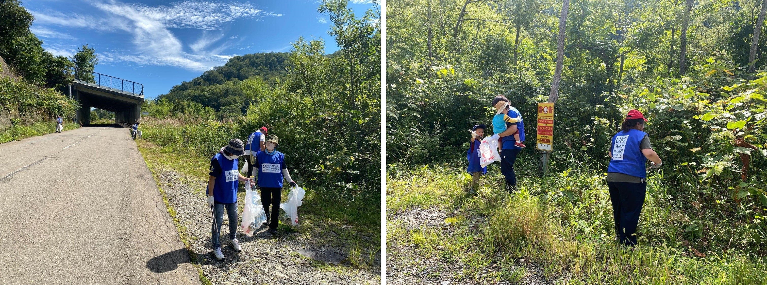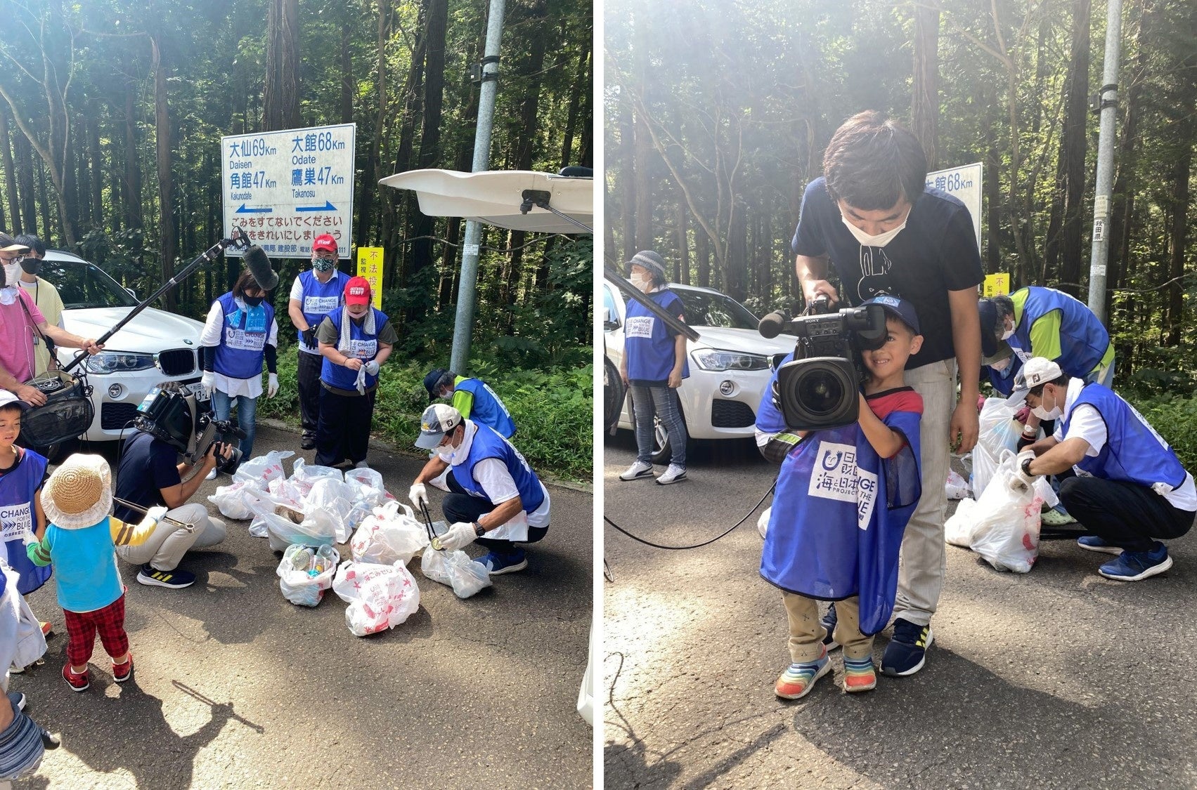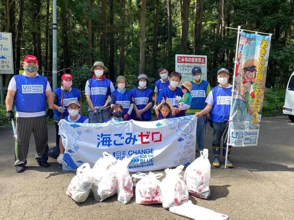 山間といえどもコース上からは、車からポイ捨てされた空き缶やペットボトル、お弁当の空き箱などのごみが道の片隅や、草むらから沢山回収されました。大会が開催される24~25日には、参加ランナーを始め、エイドステーションのボランティアの方々、大会関係者、応援する人たちなど、大会に関わる全ての人たちに、秋田の美しい海を守っていく為、ごみの分別・ポイ捨てストップなどを啓発するチラシや、海と日本プロジェクト・CHANGE FOR THE BLUEのごみ袋の配布も行い、秋田の海洋ごみゼロを目指す活動をPRします。
