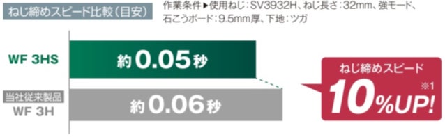 当社従来製品WF 3Hと比較して、ねじ締め速度が10%アップし、リズムよく軽快に作業できます。