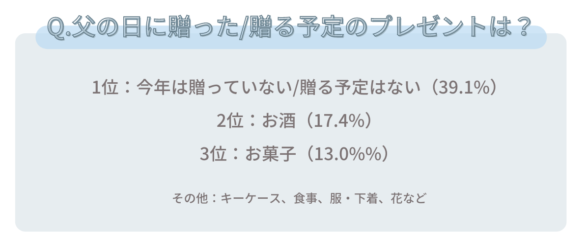 父の日に何をプレゼントするかを調査した結果、「今年は何も送る予定がない」の回答が39.1%と最も多く見られました。