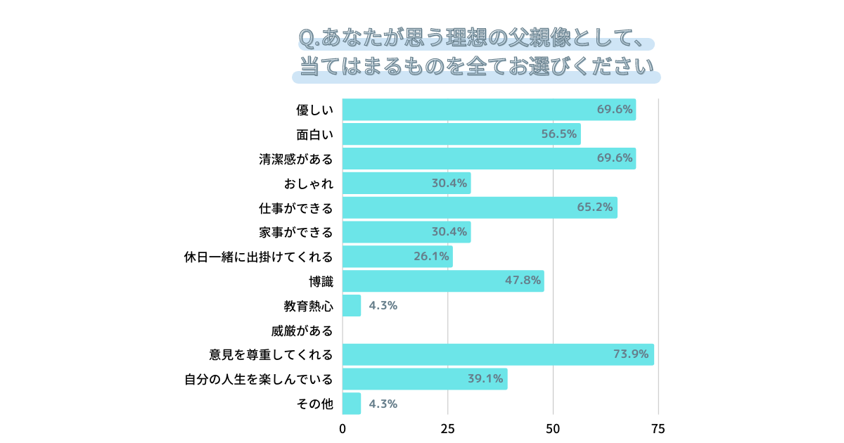続いて、「優しい(69.6%)」「清潔感がある(69.6%)」がランクイン。一方で「教育熱心(4.3%)」や「威厳がある(0%)」がワーストの結果となりました。やはり、Z世代の娘から見て厳しい威厳のある父親よりも、優しくて意見を尊重してくれる父親像を望んでいるようです。