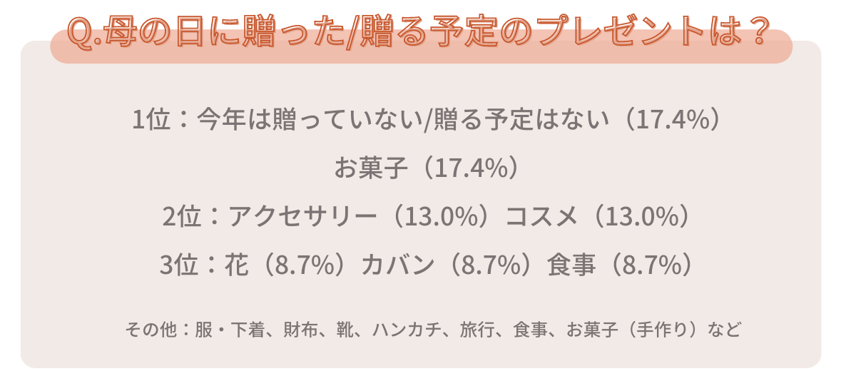 母の日は、「何も送っていない」の回答は17.4%と、父の日に何も送らない人の半数以下という結果となり、「お菓子(17.4%)」や「コスメ(13.0%)」「アクセサリー(13.0%)」の回答も多く見られました。