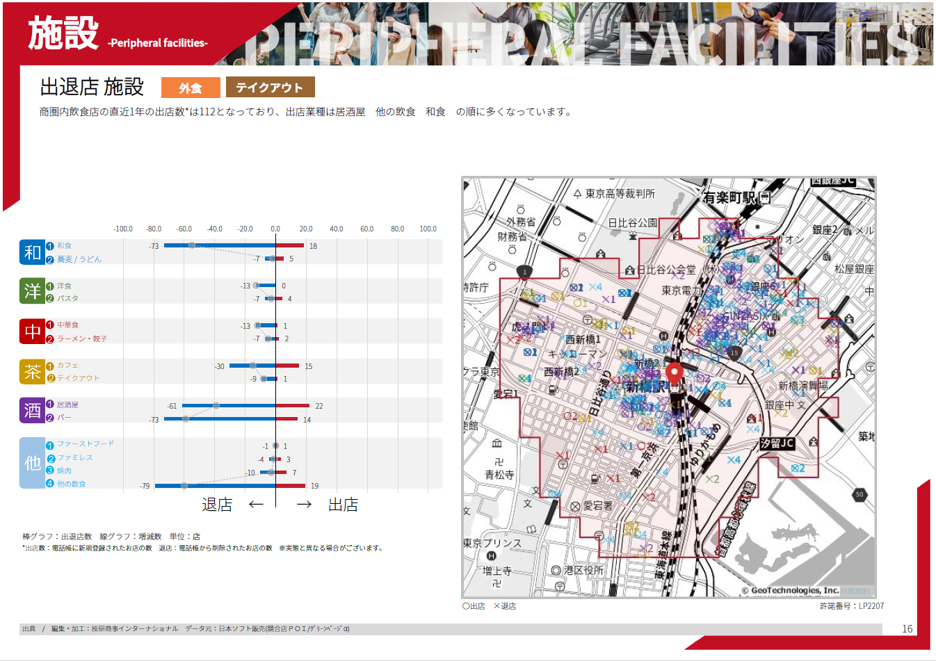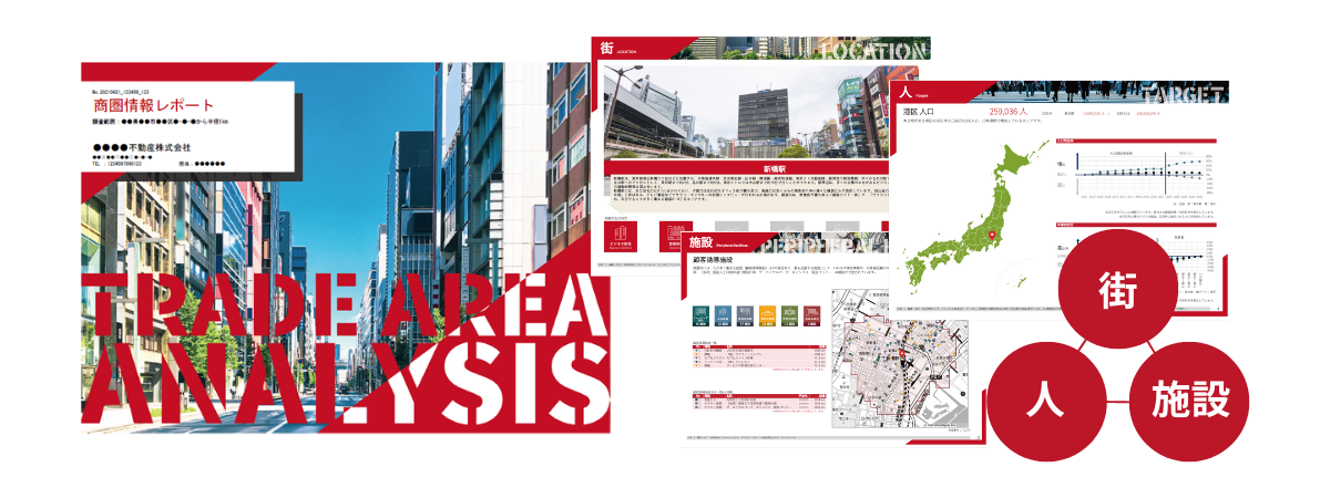 店舗物件周辺の各種データを、「街」「人」「施設」の3軸で、全26ページに分かりやすく集約。アイコンやグラフィックを多用しており、出力してすぐにリッチなプレゼンテーション資料としてご活用いただけます。