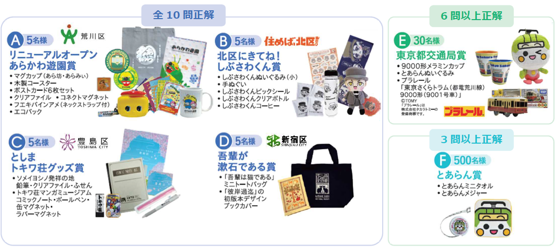 ○沿線10施設のクイズポイントをめぐり、‟クイズ帳(https://prtimes.jp/a/?f=d52467-20220928-e19294338e9df76cb4f9b77522f24403.pdf)“の回答欄に回答し応募すると、抽選で東京さくらトラム(都電荒川線)沿線4区の素敵な賞品や交通局グッズが当たります。その他、正答数に応じて応募できる賞品も用意しています。