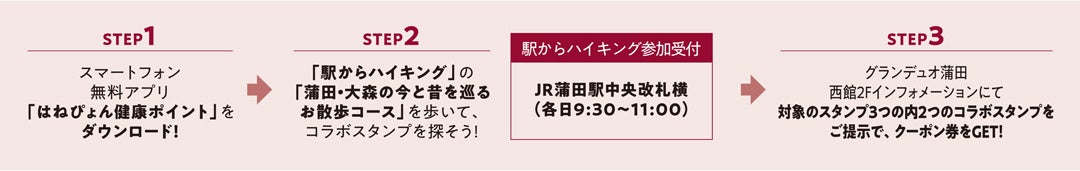 大田区が提供しているアプリ「はねぴょん健康ポイント」を利用して、JR東日本2022年度「駅からハイキング」の「蒲田・大森の今と昔を巡るお散歩コース」内に設置したコラボスタンプ3つの内2つのスタンプを取得したお客さまに、グランデュオ蒲田で使える「レストランお食事券500円&カフェ300円引きクーポン券」をプレゼント!街を散策したあとは、グランデュオ蒲田でのお食事をお楽しみください。
