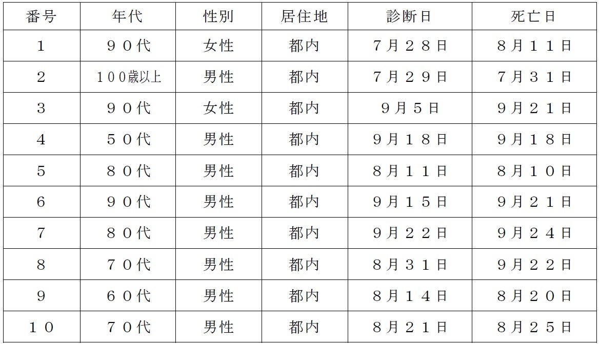 新型コロナウイルスに関連した患者の死亡について business Twitter Facebook はてブ Pocket LINE コピー 2022.09.28 この記事は約1分で読めます。 都内で新型コロナウイルスに感染した方が死亡されましたのでお知らせします。 お亡くなりになった方のご冥福をお祈り申し上げます。 1 新型コロナウイルスに関連した死亡者(本日公表分) ※患者・御家族の人権尊重・個人情報保護に御理解と御配慮をお願いします。 2 新型コロナウイルスに関連した死亡者の累計 5,810 人