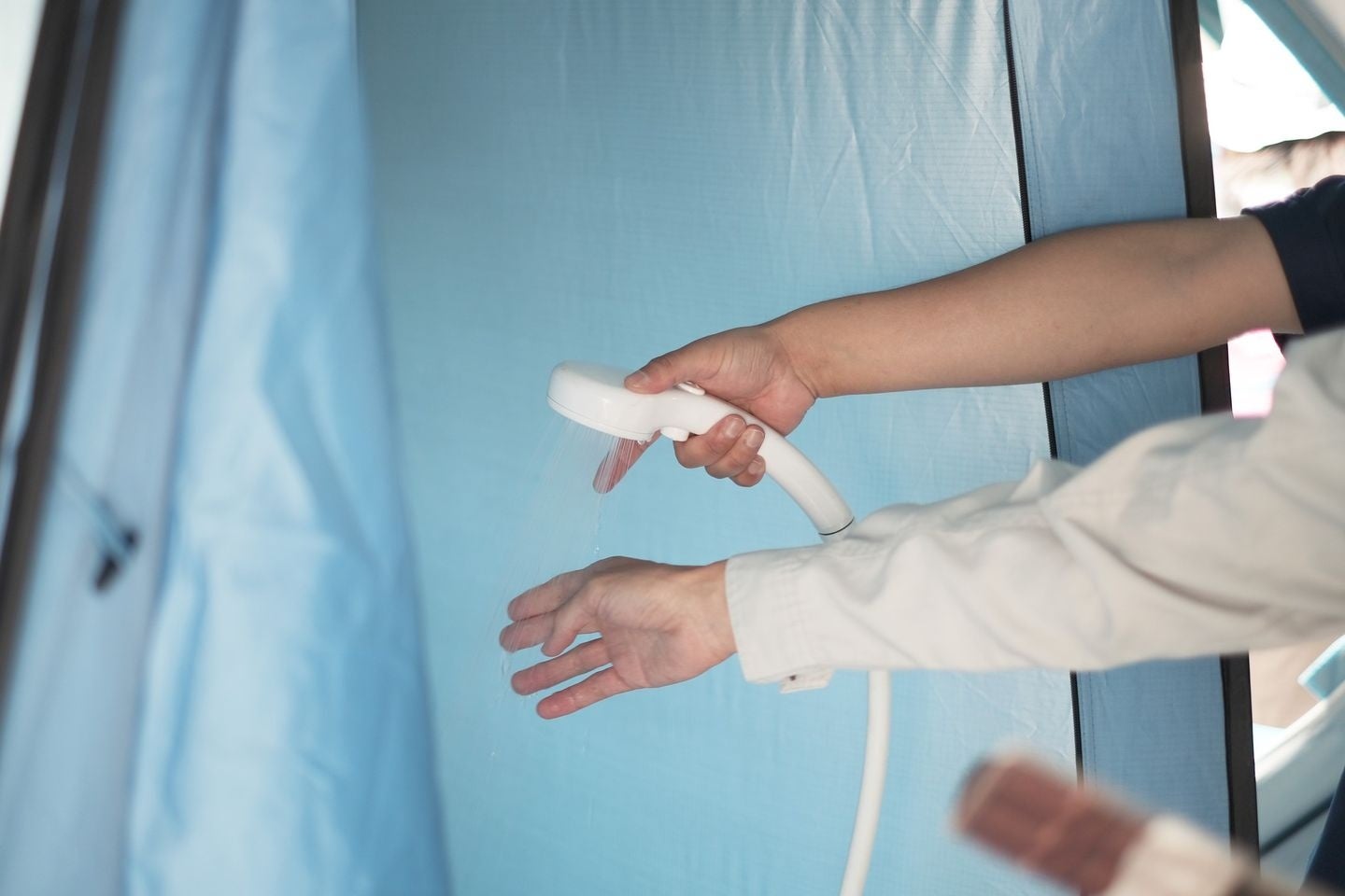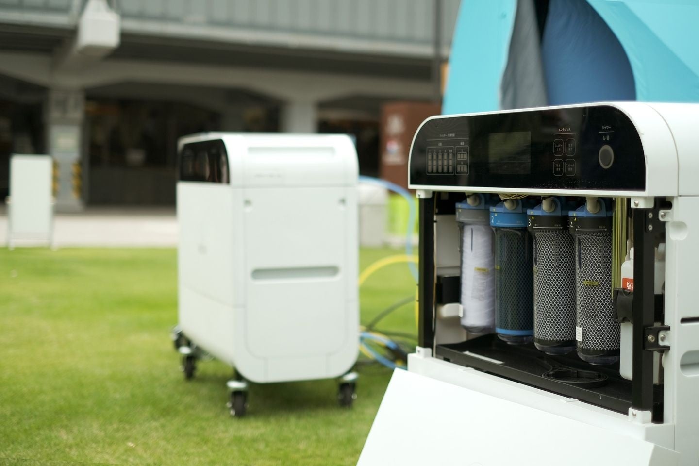 WOTA BOXは、水道がなくてもシャワーや手洗いをはじめとした様々な水回り設備に接続可能な水循環システムです。水循環の技術により、排水をろ過して繰り返し循環させることで、排水の量を通常の50分の1以下に抑えることが可能となり、100Lの水で約100回のシャワー入浴を実現します。配管工事が不要で電源さえ確保できれば短時間で設置して快適な水をお使いいただけるため、災害時をはじめ、屋外イベントなど様々なシーンでの活用が期待されています。AI による水質監視・管理により、常に安全な水をご利用いただけます。
