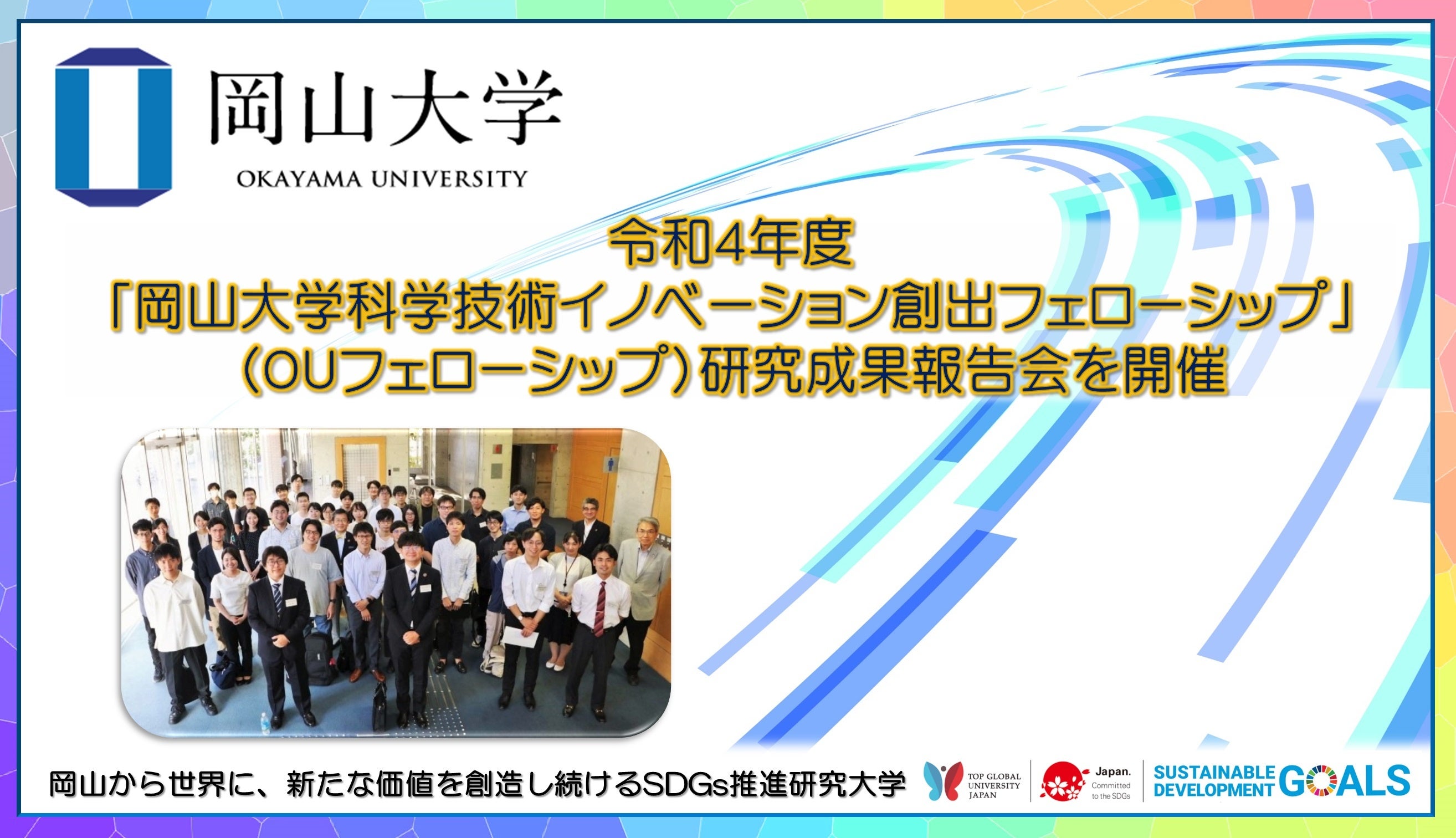 国立大学法人岡山大学(本部:岡山市北区、学長:槇野博史)は2022年9月20日、令和4年度「岡山大学科学技術イノベーション創出フェローシップ」(通称:OUフェローシップ)の研究成果報告会を本学津島キャンパス(岡山市北区)にある創立五十周年記念館で行いました。