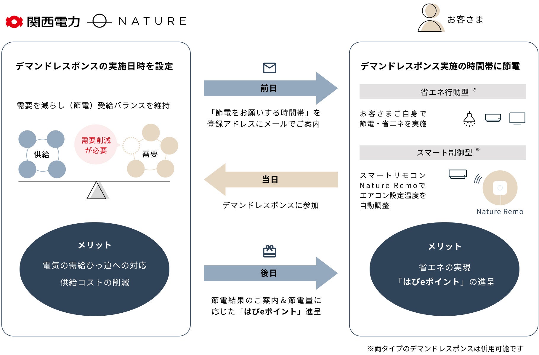 関西電力が前日にお知らせする対象時間に節電を実施いただくと、お客さまごとに算定する標準的な使用量と比較し、節電実績に応じて、ポイント(※)が進呈されるプロジェクトです。本プロジェクトは需給ひっ迫リスクに対する効果的な節電の実現を、お客さまにご協力いただくとともに目指すもので、より高い効果が期待できる「Nature Remo」の「Nature Smart Eco Mode」を活用したスマート制御型のデマンドレスポンスも実施いたします。