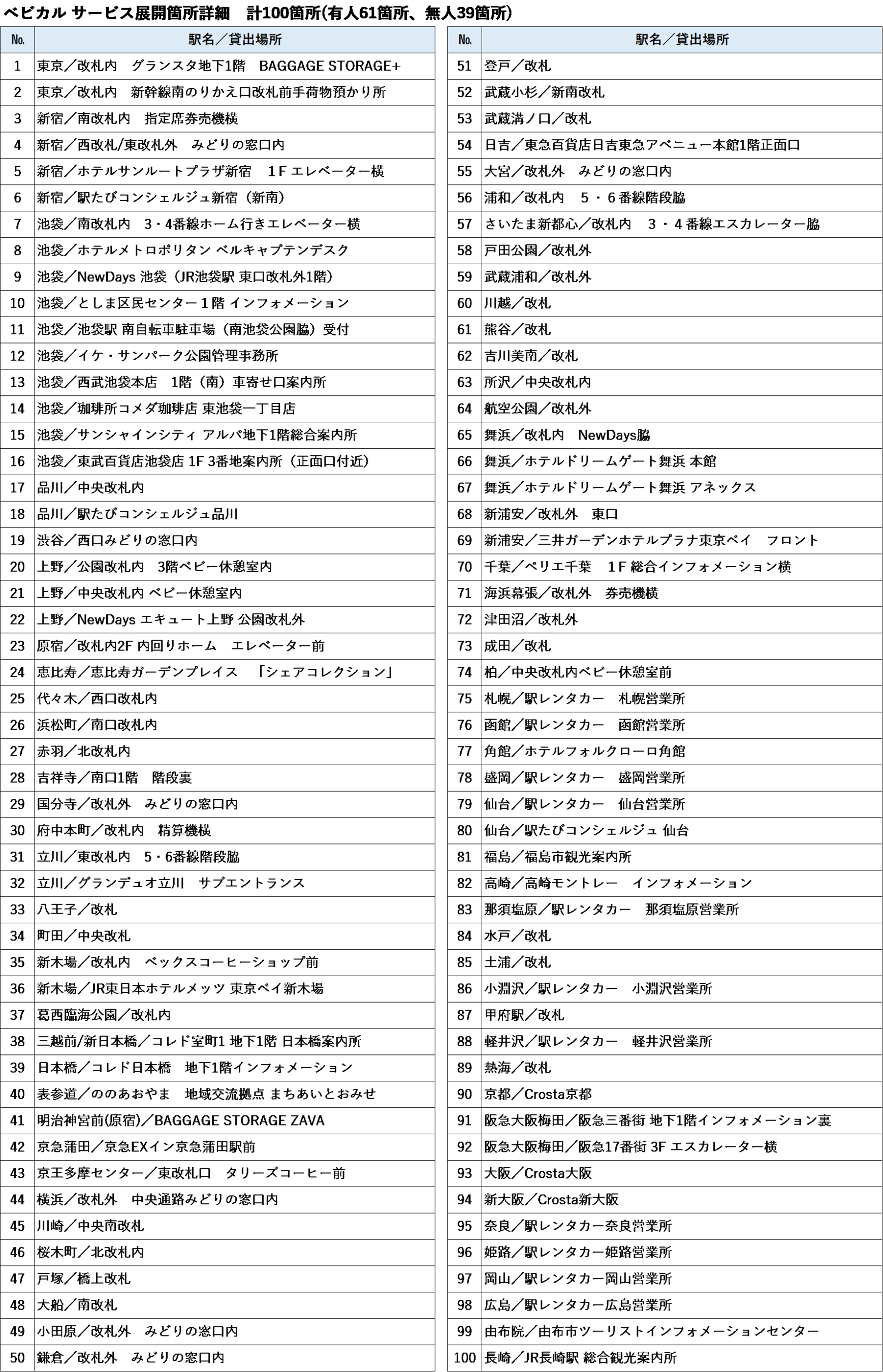 計100箇所(有人61箇所、無人39箇所)