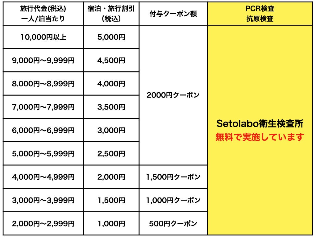 PCR検査・抗原定量検査:旅行・宿泊開始日の前日から起算して3日以内に陰性であること