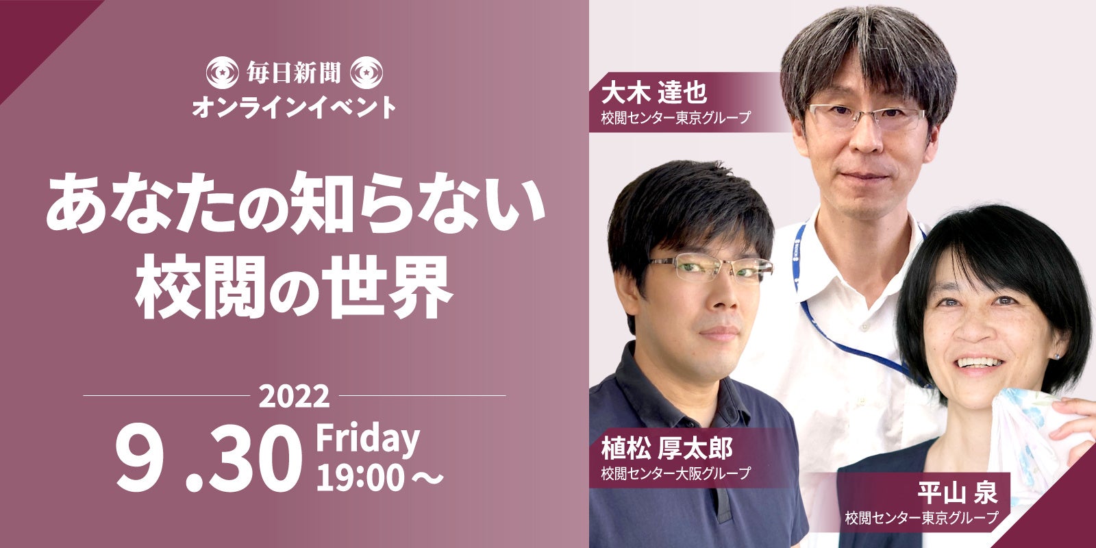 聞き手は「記者時代、訂正・おわびにつながる間違いを校閲記者に助けられること数知れず」という毎日新聞人事本部の三木陽介・採用担当部長が務めます。文章の校閲・構成に興味がある方から「毎日ことば」のファン、さらに、ことばそのものに興味がある方まで幅広くお楽しみいただける内容です。ご期待ください。