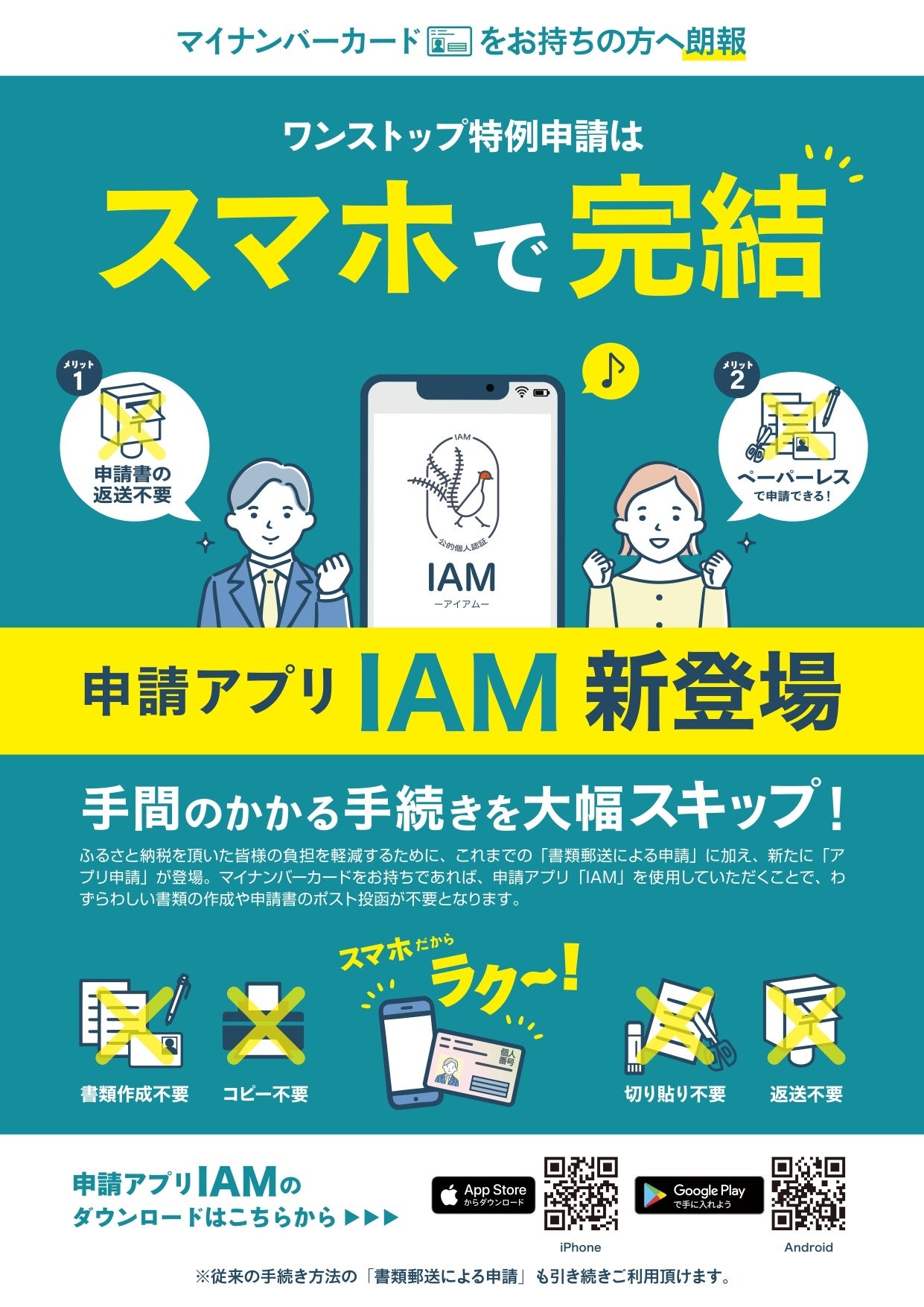 玄海町では、10月からワンストップの申請アプリ「IAM(アイアム)」の活用をスタートしました。マイナンバーカードがあれば、今まで面倒だった書類のやりとりも一切不要。スマホで簡単に「ふるさと納税」のお申し込みが完結します。