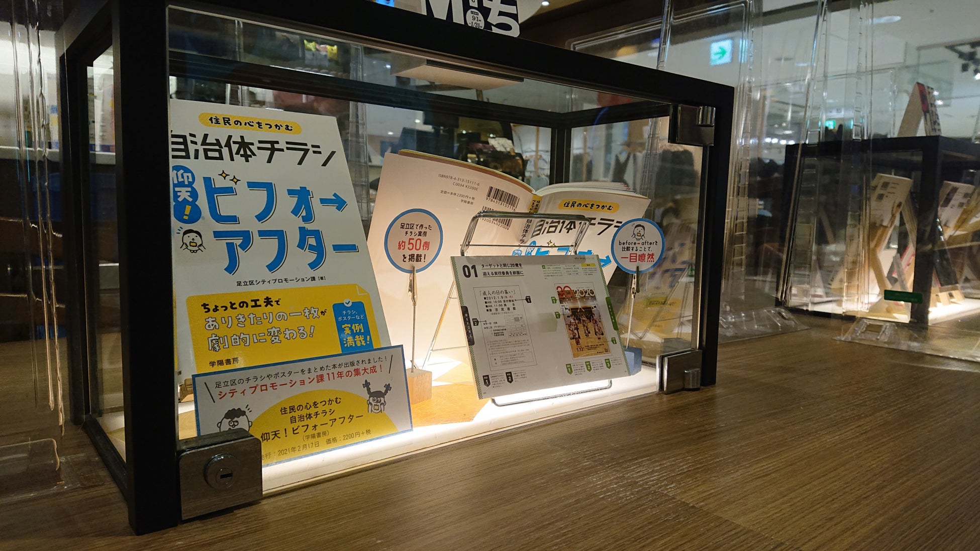 店舗内にある3つのショーケースに、本の実物を展示。ゆっくり飲食しながら、足立区にまつわる本の展示をご覧いただけます。