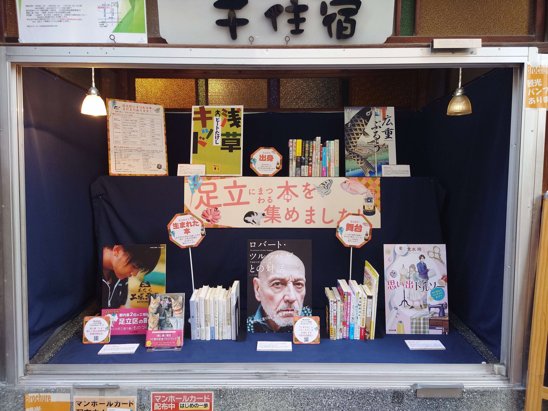 その他、千住エリアの観光案内を行っている「お休み処 千住街の駅」や「タリーズコーヒー ルミネ北千住店」では「足立にまつわる本」の展示を実施。
