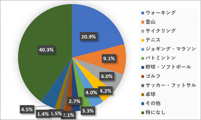 スポーツの秋において、やりたくなるスポーツは、「ウォーキング」が20.9%と一番多い結果になりました。次いで、「登山」が9.1%、「サイクリング」が6.0%になりました。球技ではなく、「ウォーキング」や「登山」などの気軽にできるスポーツに回答が集中しました。