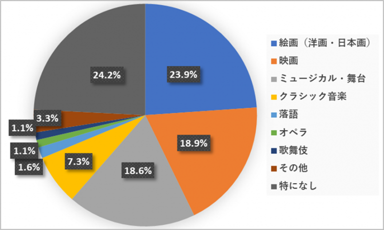 一番行ってみたい芸術鑑賞は、「絵画(洋画・日本画)」と回答した方が23.9%で最も多いことがわかりました。次いで、「映画」と回答した方が18.9%、「ミュージカル・舞台」と回答した方が18.6%という結果になりました。回答結果から、趣味と関連した回答をしているかもしれませんね。