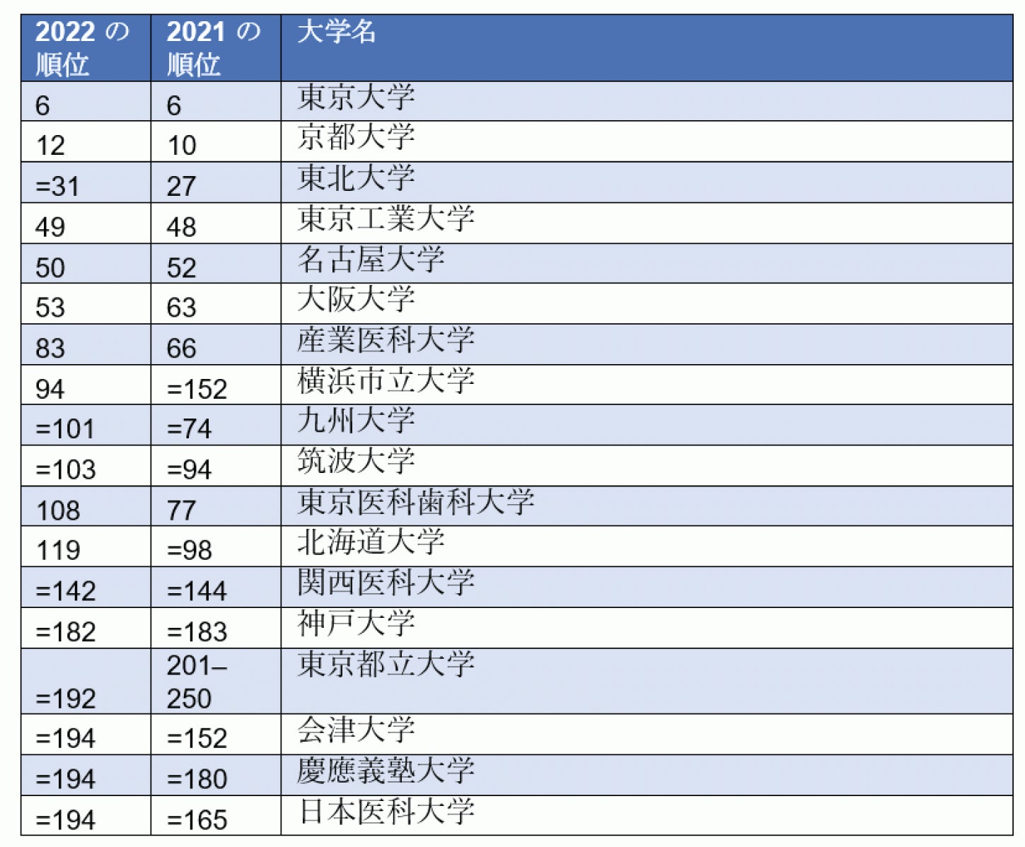 • 日本の大学は全体的に順位を下げる傾向にあり、京都大学はトップ10から脱落しました。