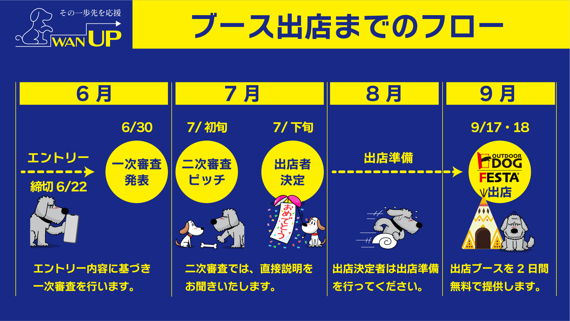 そこで、今までに無かった新たな「モノ」「コト」「サービス」に挑戦するスタートアップの方々に、多くのワンちゃんや飼主さんと直接関わりを持ち、アピールできる機会を提供するスタートアップ支援プロジェクト「WAN UP」を立ち上げる運びとなりました。