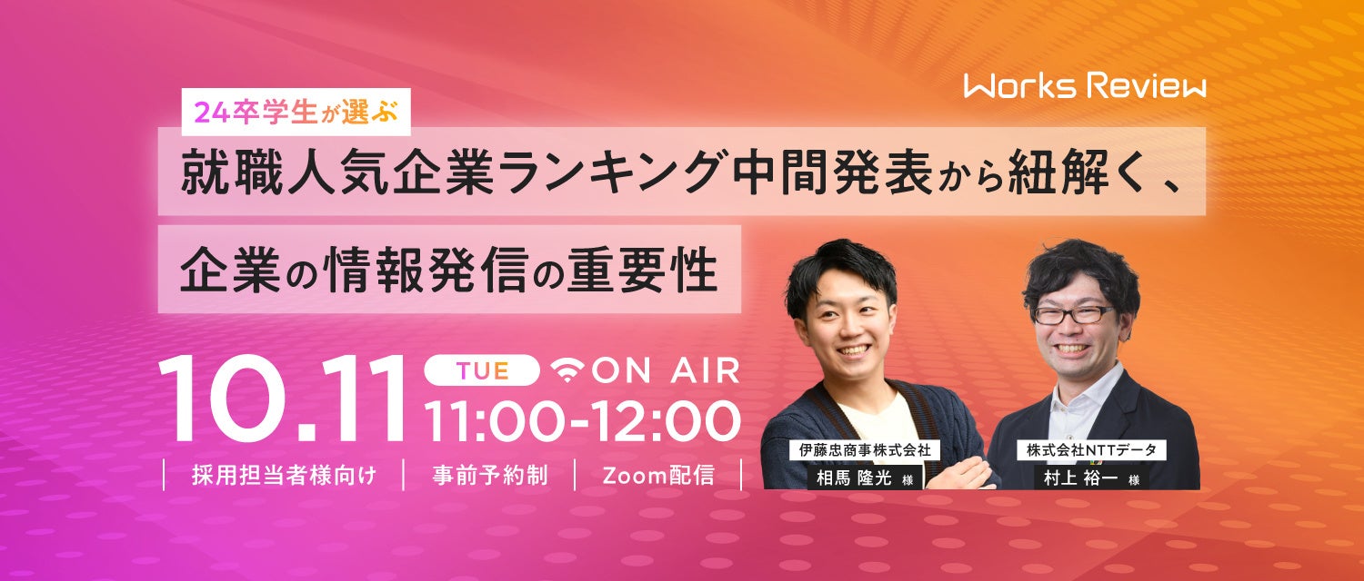 今回は中間結果発表にて文系総合・理系総合の1位にランクインされた伊藤忠商事様、NTTデータ様にご登壇いただき、ここまでの24卒採用での具体的な取り組みや情報発信方法をお伺いしながら、学生に支持される企業になるためのヒントをレビューしていきます。
