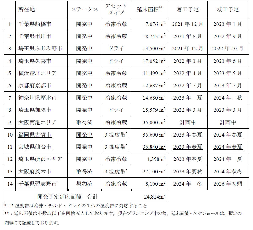 宮城県仙台市プロジェクトと福岡県古賀市プロジェクトは、それぞれ開発SPCである合同会社LOGI FLAG 6号、合同会社LOGI FLAG 7号への売却を予定しており、当社はこれらプロジェクトが開発フェーズに移行するタイミングで合同会社LOGI FLAG 6号および合同会社LOGI FLAG 7号それぞれとアセットマネジメント契約を締結し、物流施設開発(開発、運用、売却等)に係るマネジメント業務を受託予定です。