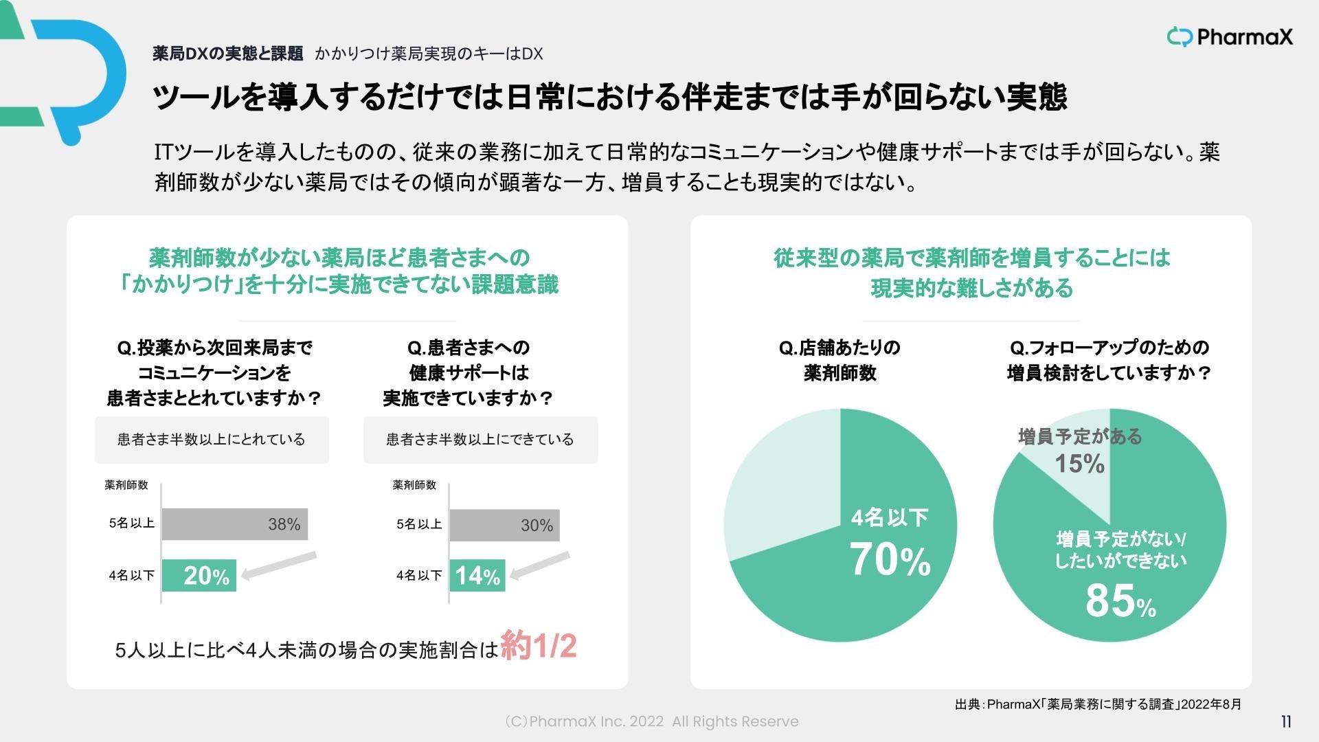 ITツールを導入したものの、従来の業務に加えて日常的なコミュニケーションや健康サポートまでは手が回らない。薬剤師数が少ない薬局ではその傾向が顕著な一方、増員することも現実的ではない。