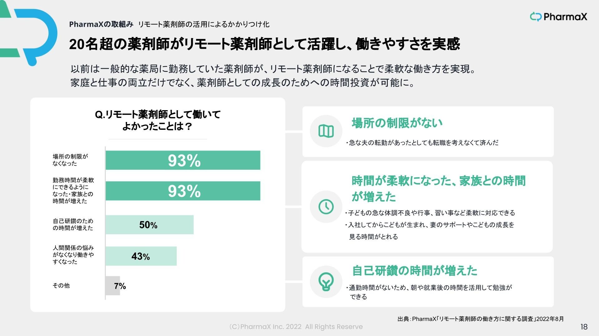 PharmaXは、自社薬局を中心にリモート薬剤師の活用と独自システムを開発することで新しい薬局オペレーションを構築し、次世代型「かかりつけオンライン薬局」を提供しております。薬局領域におけるDX事例についてご紹介できるほか、柔軟にパートナー企業様との取り組みをさせていただいております。今回、薬局事業者の取り組みに役立てていただくことを目的に、かかりつけ薬局実現の鍵となるリモート薬剤師の活用についてのリサーチレポート(ホワイトペーパー)を無料公開しました。