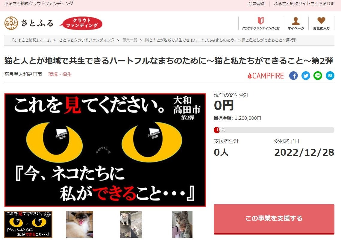 奈良県大和高田市では、人と猫が共生できるまちの実現を目指して、野良猫を捕まえて一時保護し、避妊・去勢手術を行った後、元の場所に戻す「TNR活動(※)」や、市内の野良猫の避妊・去勢手術を一部助成するなどの取り組みを行っています。2021年に実施した「さとふるクラウドファンディング」では目標の約1.5倍となる150万円以上の寄付が集まり、2022年4月から寄付金を活用した事業を開始することができました。2022年9月26日時点で手術の申請は90匹を超えたほか、TNR活動時における子猫の保護や負傷猫の治療費補助にも活用されました。大和高田市は少しでも多くの「ちいさな命」を救うためにこの事業の継続は不可欠と考えており、来年度も引き続き支援を行うため再び寄付を募集します。寄付金額は1,000円以上の金額を1円単位で自由に設定することが可能です。