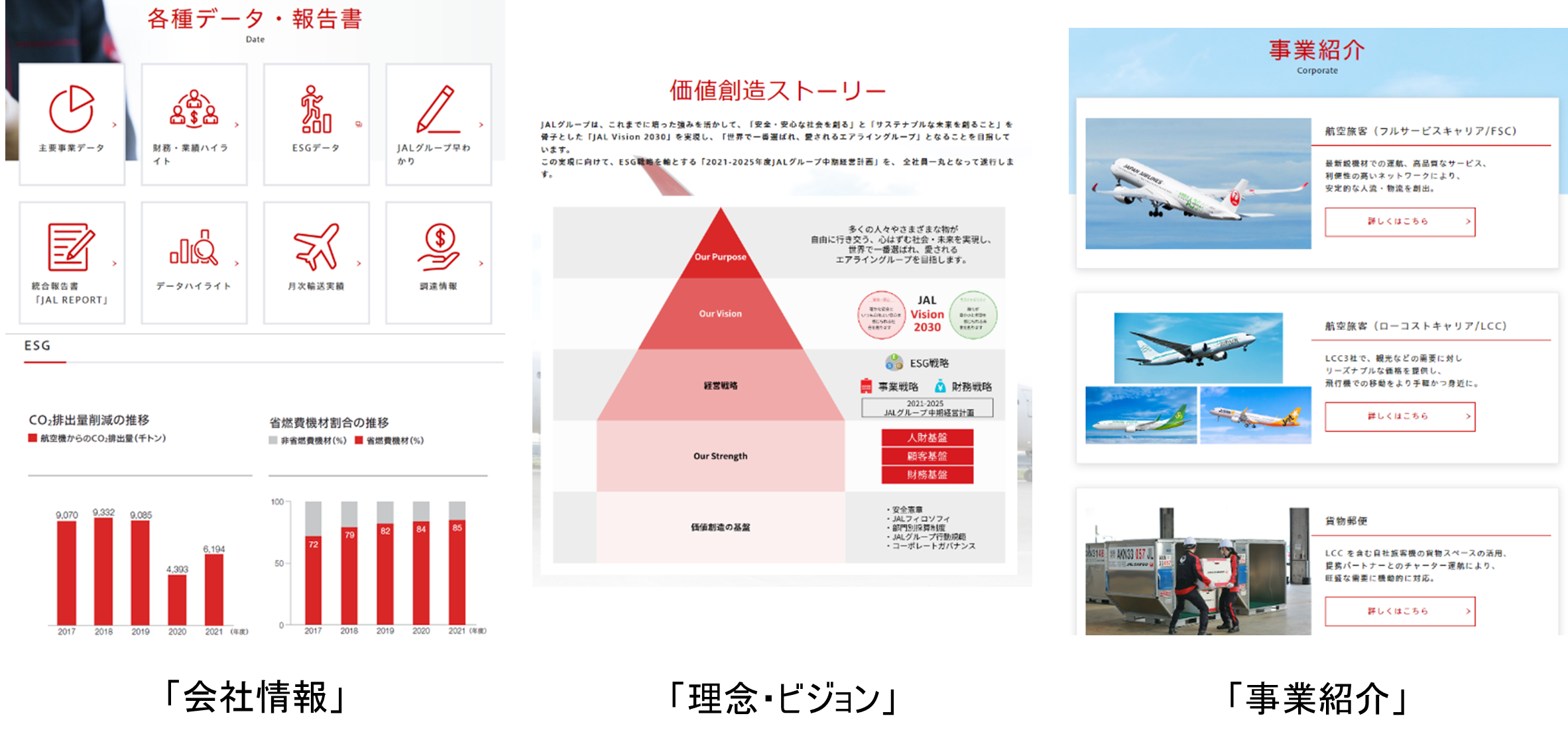 「会社情報」では、会社概要、組織概要、グループ各社一覧などの基本情報に加え、新たに「各種データ・報告」エリアを配置して、ESG、事業、財務に関する主要データの経年変化をデータハイライトとしてまとめて掲載するなど、JALの取り組みの成果を数値で分かりやすくご紹介しています。