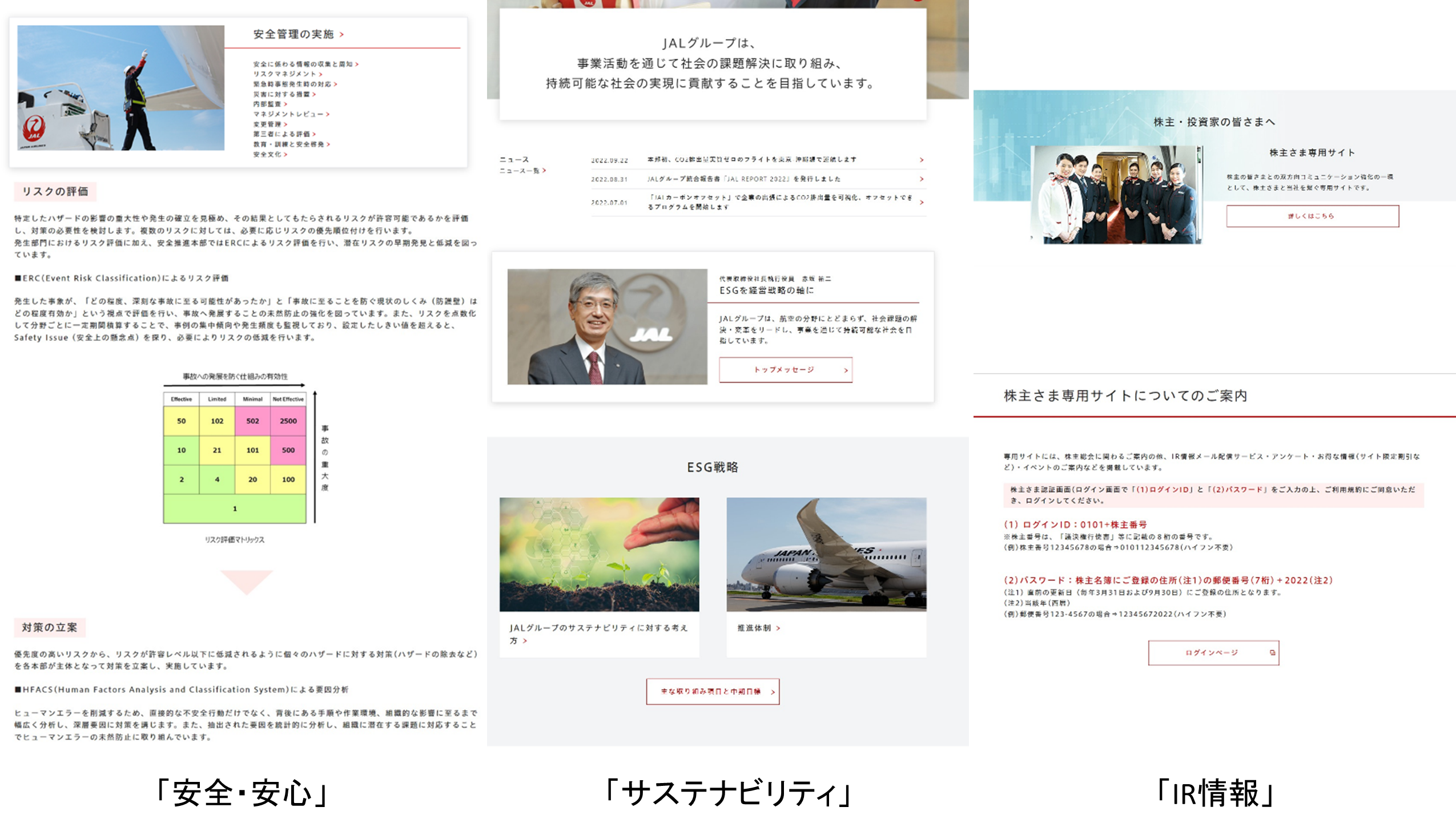 「安全・安心」では、安全管理の方針設定、体制構築、リスクマネジメントや教育訓練など、JALの安全・安心に向けての取り組みに加えて、新たにリスク評価や対策なども具体的に記載の上、整理してご紹介しています。