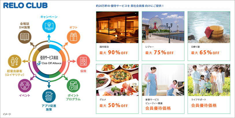 リロクラブのCRM事業は「クラブオフ(Club Off Alliance)」において、「福利厚生倶楽部」でのノウハウを活かした様々なサービスを展開しております。それぞれの企業が優良顧客を獲得するためのCRMサービスとして高い評価を受けており、企業の要望に応じたマーケティングオートメーションツールの活用やアンケート・会員分析など付加価値の高いサービス提供とカスタマーエクスペリエンス(CX)の創出は、多くの企業の顧客満足度(CS)向上に繋がっております。