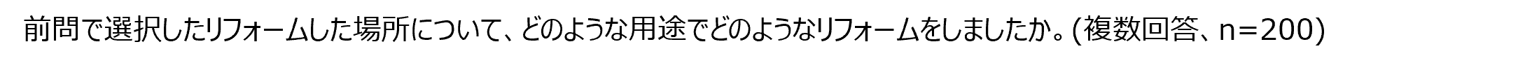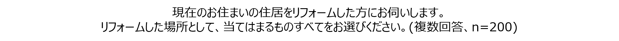 リフォーム経験者200名に対し、リフォームした場所を質問したところ、1位は「トイレ」で55.0%、2位は「浴室」で46.0%、3位は「キッチン」で41.0%という結果となりました。リフォーム理由を伺うと、「トイレ」は「タンクレストイレへの変更」や「老朽化と省エネ対策のためのトイレ本体交換」など、機能のアップグレードや老朽化対策が理由に多いことが分かりました。「浴室」は「手すりの設置」や「水道管や蛇口の設置」など老後を見据えたバリアフリー化や老朽化に伴う修繕が多く見受けられました。「キッチン」は「IHコンロの設置」や「水回りの設備の交換」など、オール電化や水回りの劣化の修繕が多いことが分かりました。
