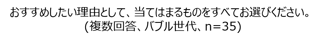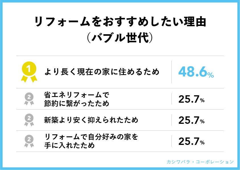 また、「リフォームをおすすめしたい」と回答したリフォーム経験者184名に「おすすめしたい理由」を質問したところ、ミレニアル世代は、「おうち時間が充実するようになったため」が最多の30.6%、「気分を変えられたため」が3位の22.2%の回答となり、ミレニアル世代は「自宅で過ごす時間の充実化」がリフォームをおすすめしたい理由として多く見受けられました。一方、バブル世代は「より長く現在の家に住めるようになったため」が最多の48.6%、続いて「省エネリフォームで節約に繋がったため」・「新築より安く抑えられたため」・「リフォームで自分好みの家を手に入れたため」が同率の25.7%という結果となり、バブル世代は「経済的な理由」によりリフォームをおすすめしたいと考える人が多いことが分かりました。世代により、リフォームに満足している理由が異なることが判明しました。