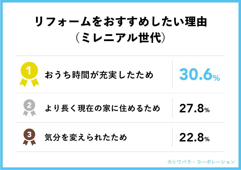 - リフォームをおすすめしたい理由上位に、ミレニアル世代は「自宅時間の充実化」、バブル世代は「経済的な理由」がランクイン