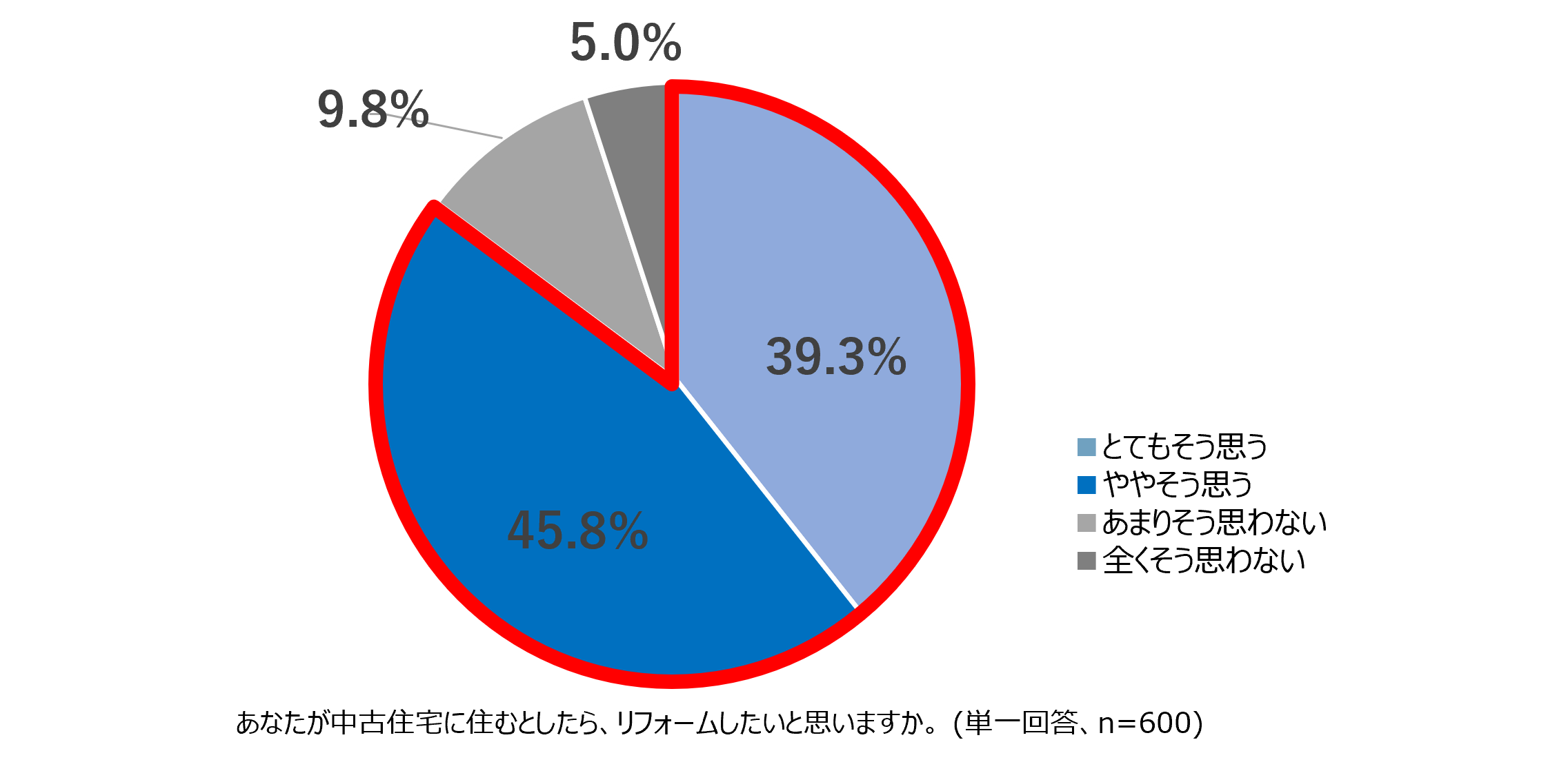 また、「あなたが中古住宅に住むとしたら、リフォームをしたいと思いますか。」という質問に対しては、85.1%の人が「とてもそう思う」「ややそう思う」を回答し、中古住宅に住む場合はリフォームを希望する人が非常に多いことが分かりました。