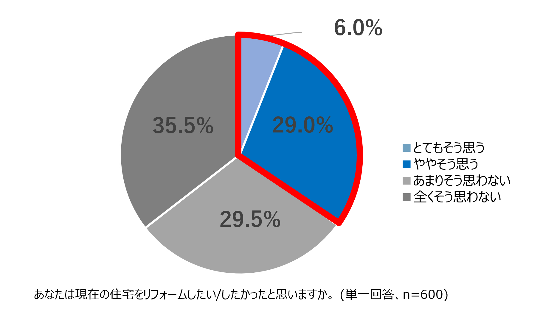 「あなたは現在の住宅をリフォームしたい/したかったと思いますか。」という質問に、600名の回答者のうち、「とても思う」「ややそう思う」と回答した人は35%という結果になりました。「リフォームをしたい/したかった」と回答した人140名に「リフォームしたい/したかったと思う理由」を質問したところ、Z世代は「おうち時間・趣味の充実のため」が最多の35.7%、続いて「快適性・利便性の向上ため」が25.0%の回答となり、Z世代は自宅で過ごす時間を充実させるためにリフォームを希望する人が多いことが分かりました。一方、ポスト団塊世代は、「老後を見据えたリフォームのため」と「建物の老朽化のため」が最多の45.5%となり、ポスト団塊世代は現在の家で長く過ごすためのリフォームを希望する人が多いことが分かりました。