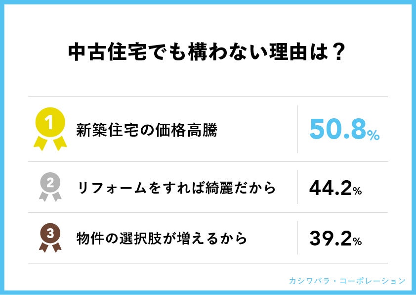 中古住宅でも構わない理由は「新築住宅の価格高騰」や「リフォームで綺麗になる」が約半数
