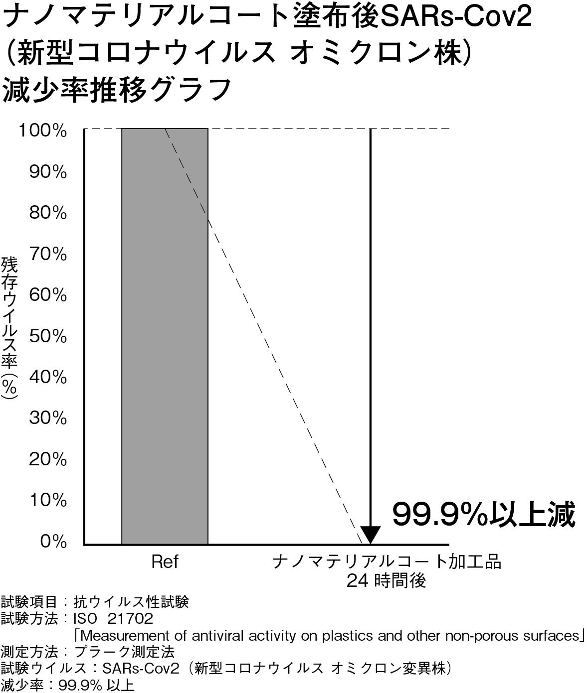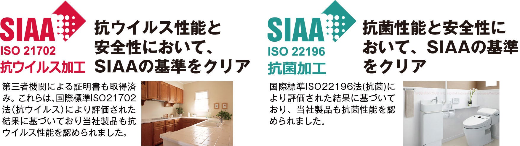 さらにナノマテリアルコートは他にもインフルエンザウイルスや大腸菌、黄色ブドウ球菌に対しても効果を確認しています。その効果は第三者機関SIAA(抗菌製品技術協議会)において、抗ウイルス性能と抗菌性能について認証を受けています。
