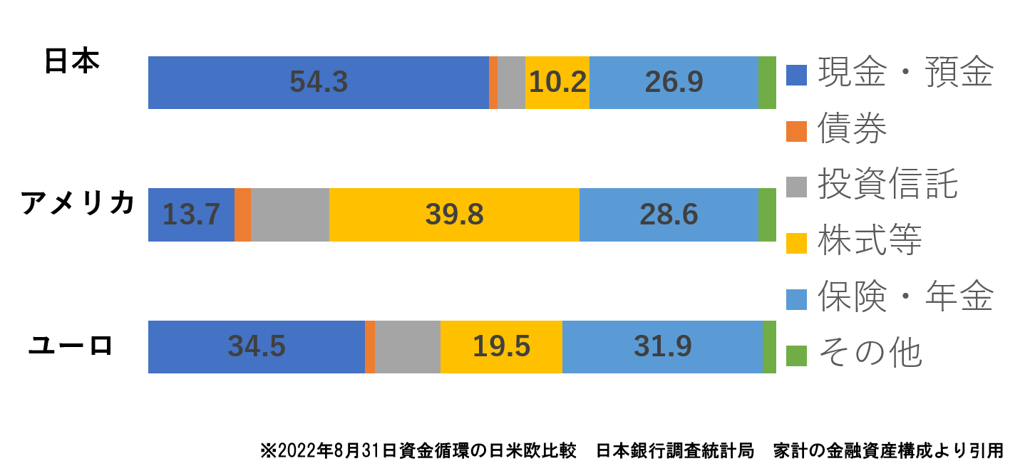 日本人の個人金融資産の内訳を見ると、半分以上の資産を現預金の形で保有している。現在日本の個人金融資産は約2000兆円と言われているので、約1000兆円超が現預金ということになる。低金利時代で預金してもほとんど利息が付かず、またインフレが進み、資産としての価値が目減りしているのにも関わらずこの現状である。 ※図表は金融資産合計に占める割合(%)