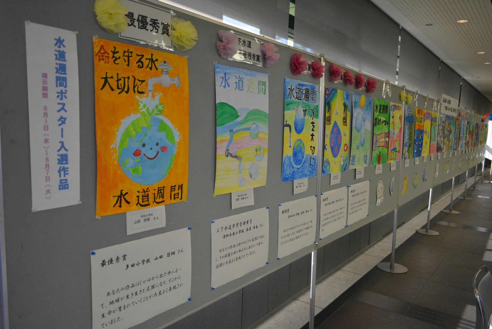 このうち、最優秀賞1名、上下水道事業管理者賞1名及び特別賞3名の方々に対して表彰式を行うとともに、下記のとおり入賞作品の展示を行っています。
