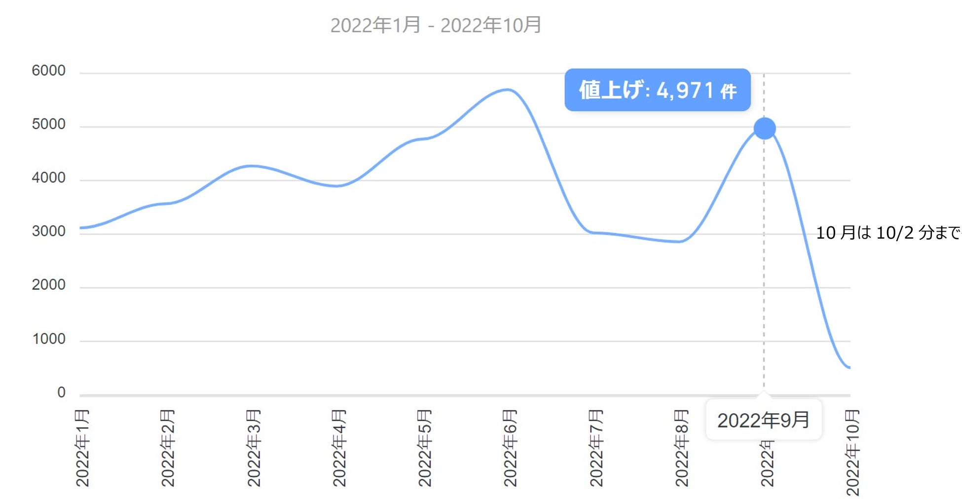 2022年7月、8月の件数はやや減少しましたが、2022年9月に再び増加に転じました。10月に暮らしに身近な食品など6,700品目が値上げされる「値上げラッシュ」となることを見込み、そのことを憂う不満の声と言えそうです。