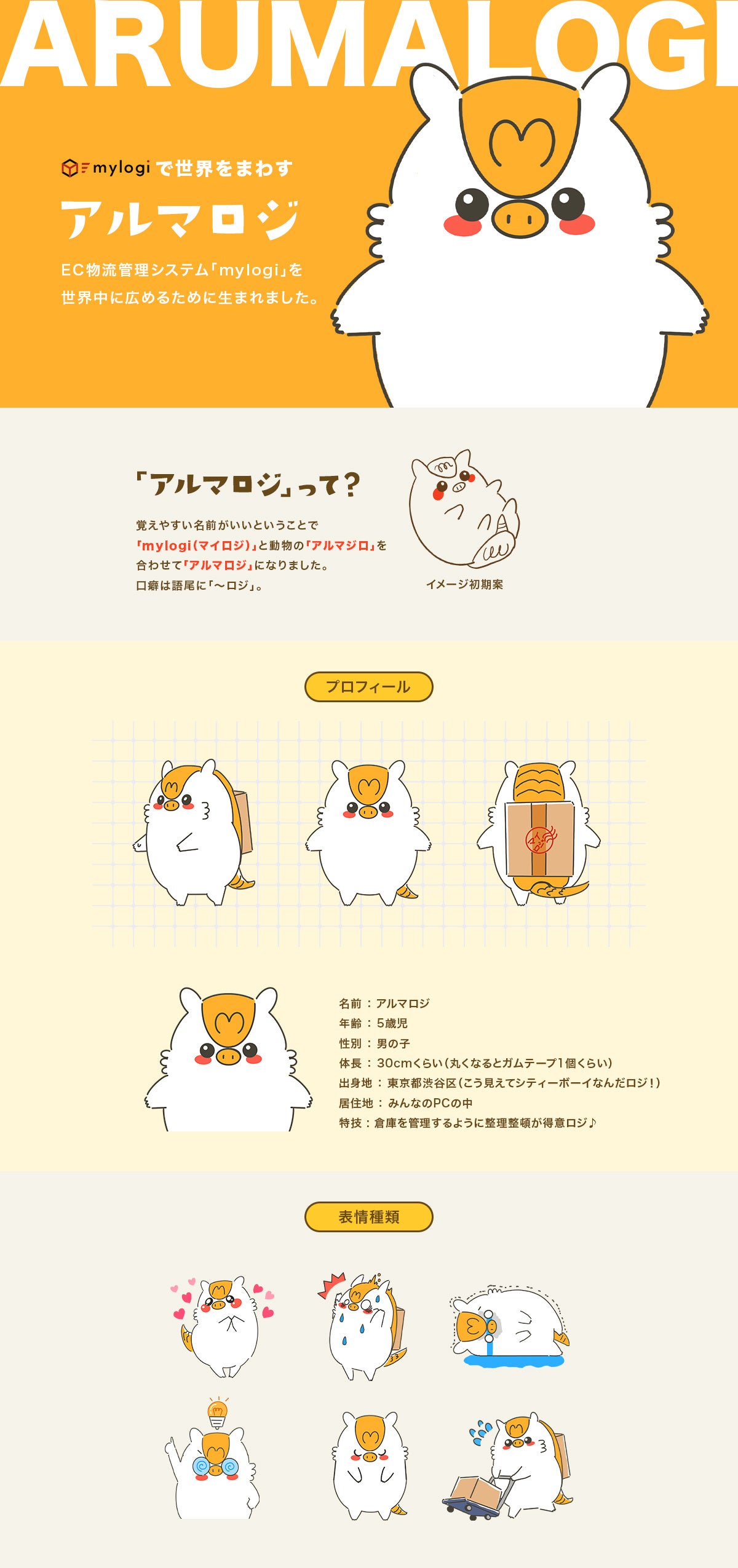 EC向け物流管理システム「mylogi」にマスコット的な可愛いキャラクターを作りたいということで提案からイラストまで担当させていただきました。