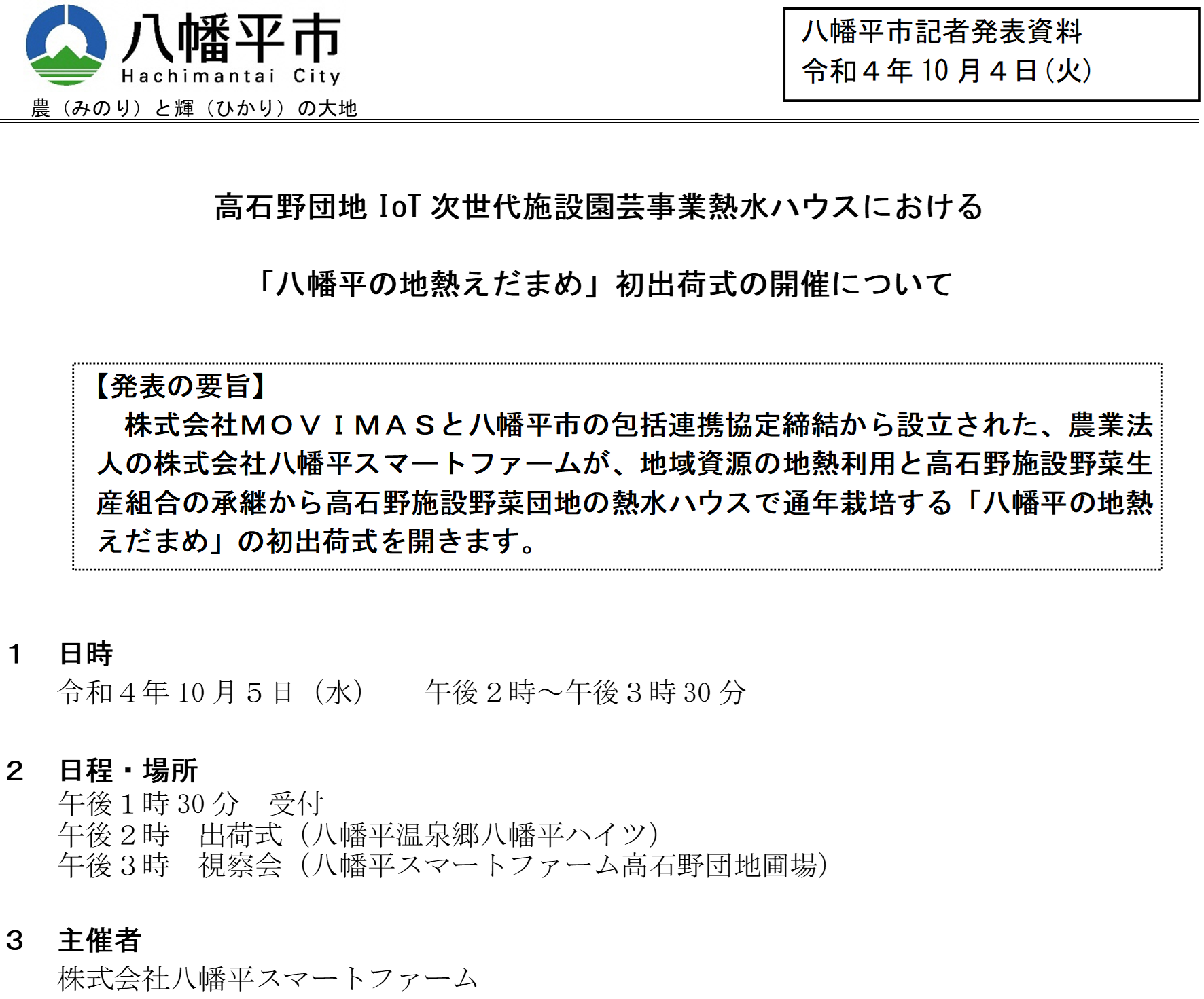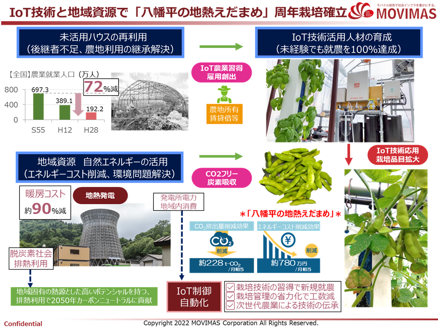 あらゆるモノがインターネットにつながる「IoT」を活用したクラウド制御システム開発を手掛ける株式会社MOVIMAS(モビマス、本社:東京都千代田区、代表取締役:兒玉則浩、以下MOVIMAS)と地熱を活用した熱水ハウスを再生する岩手県・八幡平市(市長:佐々木孝弘、以下八幡平市)のIoT農業の振興を目的とした協定締結から、農地法に定める農地所有適格法人として設立した株式会社八幡平スマートファーム(本社:岩手県八幡平市、代表取締役:兒玉則浩、以下八幡平スマートファーム)は、IoT技術と地域資源を活用した循環型社会の創造において、日本で初めて商用稼働した松川地熱発電所の温水で通年栽培する二酸化炭素(CO2)の排出を減らす「八幡平の地熱えだまめ」を脱炭素に向けた取組みの一環として、初出荷することを決定いたしましたので、お知らせします。
